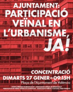 Las Asociaciones Vecinales de Campanar y Benimaclet nos concentraremos, junto con entidades sociales y culturales de sus respectivos barrios, en la Plaza del Ayuntamiento el martes 27 de enero, coincidiendo con el Pleno Municipal.