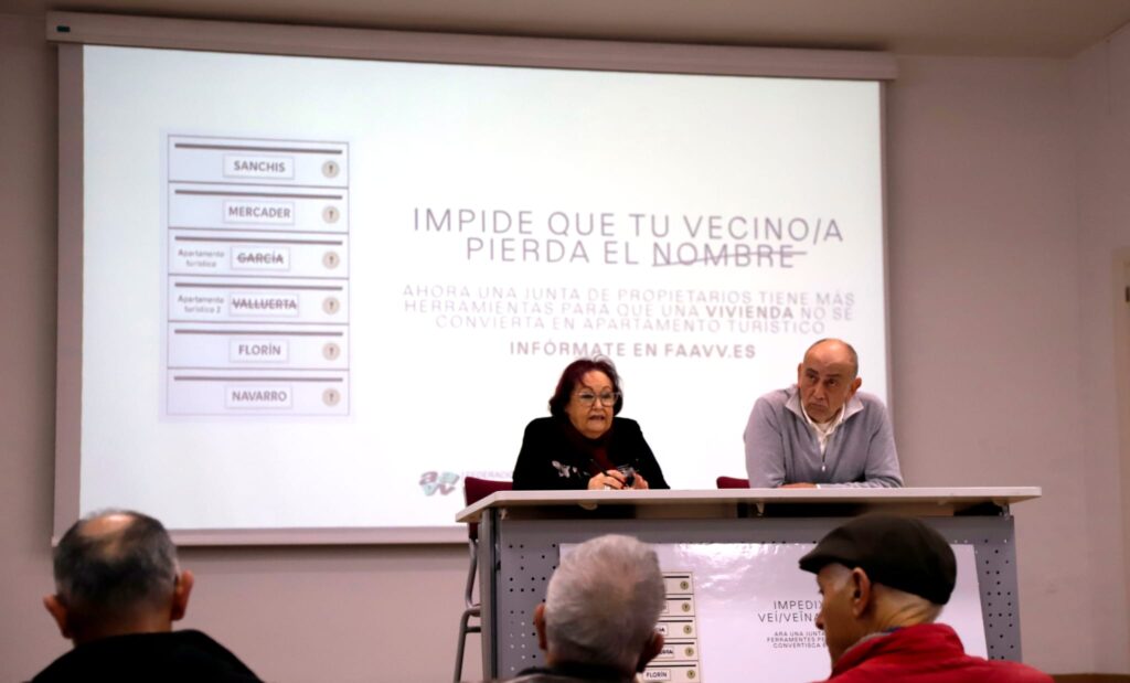 Este miércoles 28 de enero ha tenido lugar en el auditorio de la Escuela Oficial de Idiomas en Zaidia la presentación de la campaña “Impide que tu vecino/a pierda el nombre”, ideada por la Federación vecinal de València para trasmitir a toda la ciudadanía las herramientas que permite la ley para impedir que las viviendas turísticas se implanten en las comunidades de vecinos. La actividad, abierta a todas las personas que quieran asistir y promovida por todas las asociaciones vecinales de la zona norte de la ciudad, ha contado con las intervenciones de María José Broseta, presidenta de la Federació d’Associacions Veïnals de València (FAAVV), y de Toni Cassola, de la comisión de vivienda y turismo de la FAAVV.