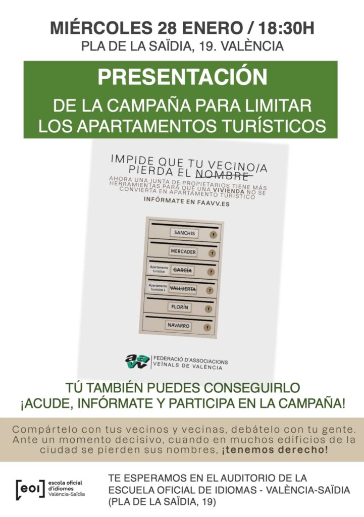 Este miércoles 28 de enero tendrá lugar en el auditorio de la Escuela Oficial de Idiomas en Zaidia la presentación de la campaña “Impide que tu vecino/a pierda el nombre”, ideada por la Federación vecinal de València para trasmitir a toda la ciudadanía las herramientas que permite la ley para impedir que las viviendas turísticas se implanten en las comunidades de vecinos. La actividad, abierta a todas las personas que quieran asistir y promovida por todas las asociaciones vecinales de la zona norte de la ciudad, comenzará a las 18:30h de este miércoles en la Escuela de Idiomas (Llano de Zaidia, número 19).